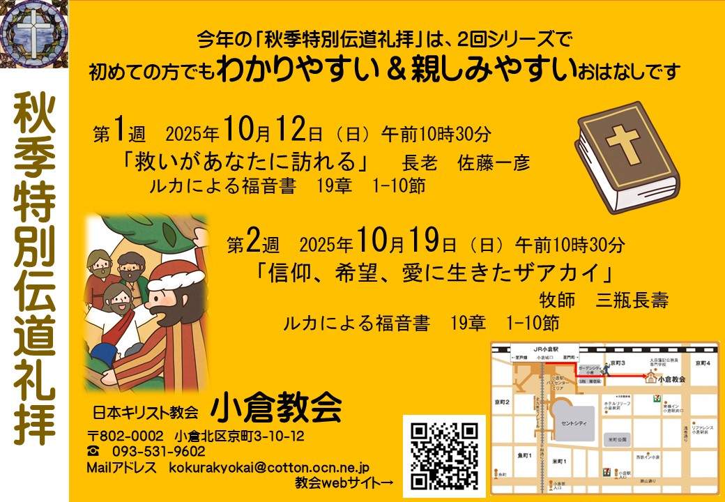 2025年 秋季特別伝道礼拝 今年は、2回に渡る伝道礼拝で『ルカによる福音書19章1-10節』から「ザアカイとキリストとの出会い」を通して神さまの大きな救いと喜びのみ言葉を聞きます。いつもより易しく、分かりやすく、親しみやすいお話しになります。教会に関心があるけど、行ったことがない…という方々も、お久しぶりの方々も、どなたさまも大歓迎です。ぜひお越しくださいませ。